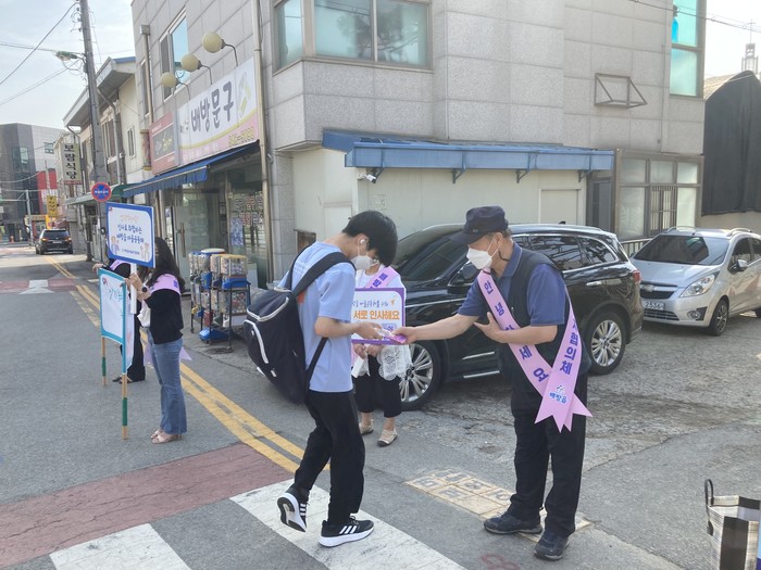 충남 아산시 배방읍은 최근 '함께 살아가는 배방만들기, 지역의 화합을 더함'을 주제로 배방읍 주민주도 마을복지계획 ‘배방지역 화합을 더함’ 2차 인사캠페인을 펼쳤다. 사진은 배방읍 인사캠페인이 진행되고 있는 모습.(사진제공=아산시청)