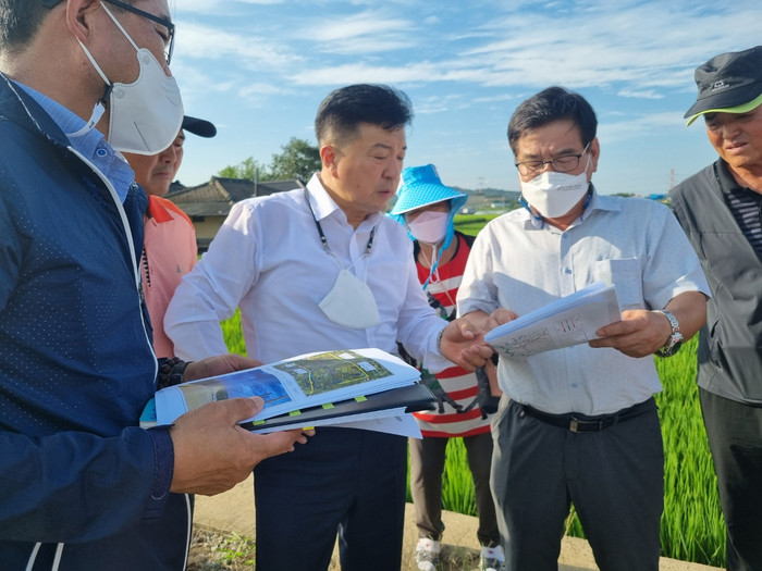 최재구 충남 예산군수는 최근 초도방문 민원 현장을 방문해 현장활동을 실시했다. 최 군수는 직접 현장을 점검하면서 관계자에게 군민의 불편 해소를 위해 신속한 내용 파악 및 추진에 나서줄 것을 적극 당부했다. 사진은 민원현장을 방문한 최 군수(가운데)가 현장 관계자로부터 설명을 듣고 있는 모습. (사진제공=예산군청)