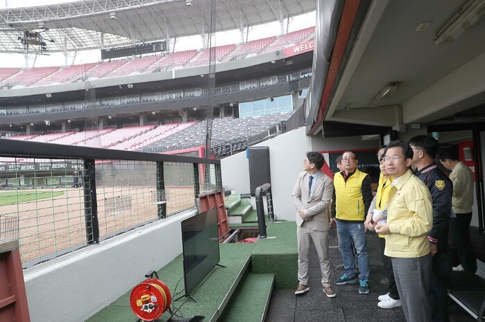 [광주=정찬남 기자] 문영훈 광주광역시 행정부시장은 12일 기아챔피언스필드를 찾아 소방·전기·건축·승강기 등 각 분야 민간전문가와 함께 시설물 안전점검을 실시했다.