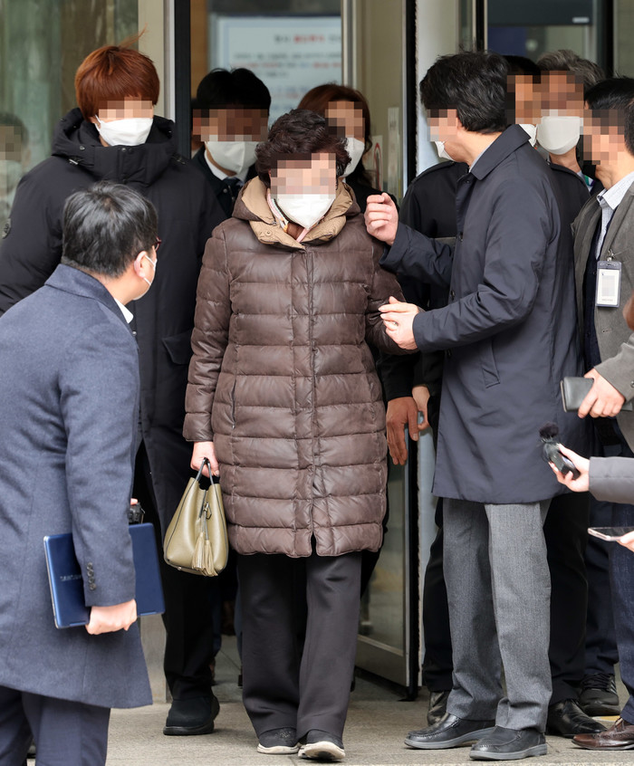 요양병원을 불법 개설해 요양급여를 타 간 혐의로 1심에서 실형을 선고받은 국민의힘 윤석열 대선후보의 장모 최은순씨가 25일 오후 서초구 서울고법에서 열린 항소심 선고 공판에서 무죄를 선고받고 밖으로 나서고 있다. (사진제공 = 연합뉴스)