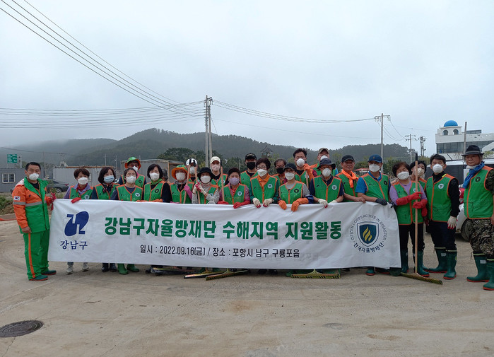 서울 강남구 자율방재단이 지난 16일 경북 포항시 남구 구룡포읍 일대의 수해 현장을 찾아 수해 복구 봉사활동을 했다. 사진은 이날 봉사자들이 기념촬영을 하고 있는 모습. (사진제공=강남구청)