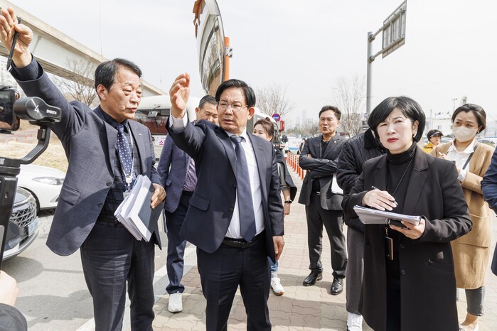 | ▲ 지난 3월 박강수 구청장(가운데)과 관계직원들이 '마포순환열차버스' 정류소 현장 여건을 답사하고 있다. (사진=마포구청 제공) |