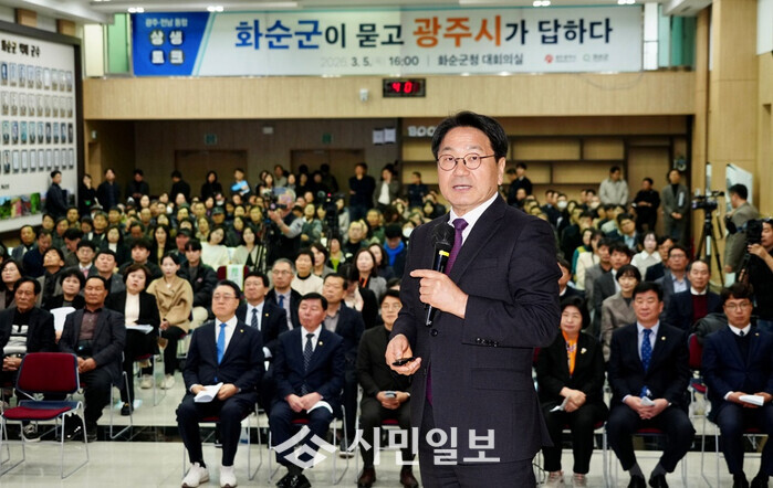 | ▲ 강기정 광주광역시장이 5일 화순군청 대회의실에서 열린 '광주전남 통합 화순군 상생토크'에 참석해 통합 이후 화순군의 발전 방안을 군민들과 공유하고 있다. /광주광역시 제공 |