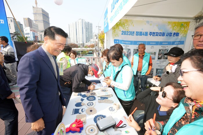 | ▲ 최근 열린 제2회 성북구 주민자치 성과공유회를 방문한 이승로 구청장(왼쪽)이 정릉4동 그린서포터즈를 찾아 대화를 나누고 았다. (사진=성북구청 제공) |