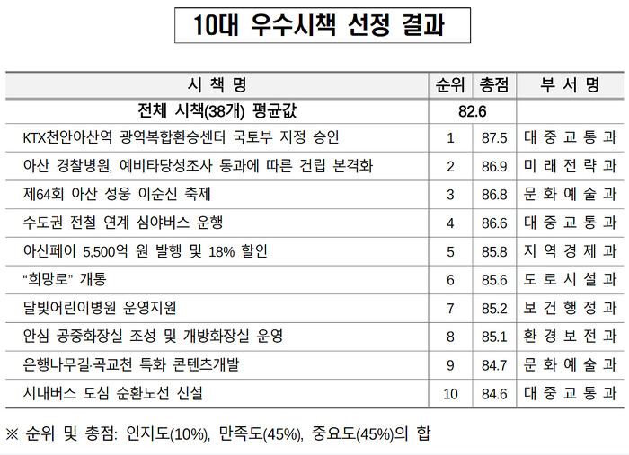 선정된 10대 우수시책은 ▲KTX천안아산역 광역복합환승센터 국토교통부 지정 승인 ▲아산 경찰병원 예비타당성조사 통과에 따른 건립 본격화 ▲제64회 아산 성웅 이순신축제 ▲수도권 전철 연계 심야버스 운행 ▲아산페이 5500억원 발행 및 18% 할인 ▲희망로 개통 ▲달빛어린이병원 운영 지원 ▲안심 공중화장실 조성 및 개방화장실 운영 ▲은행나무길·곡교천 특화 콘텐츠 개발 ▲시내버스 도심 순환노선 신설 등이다.
