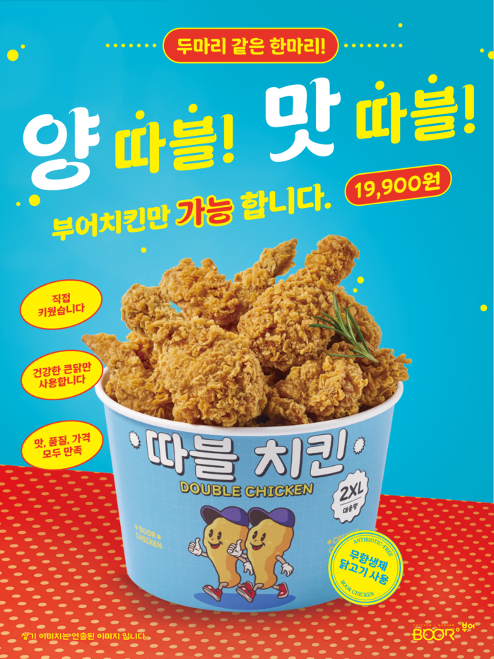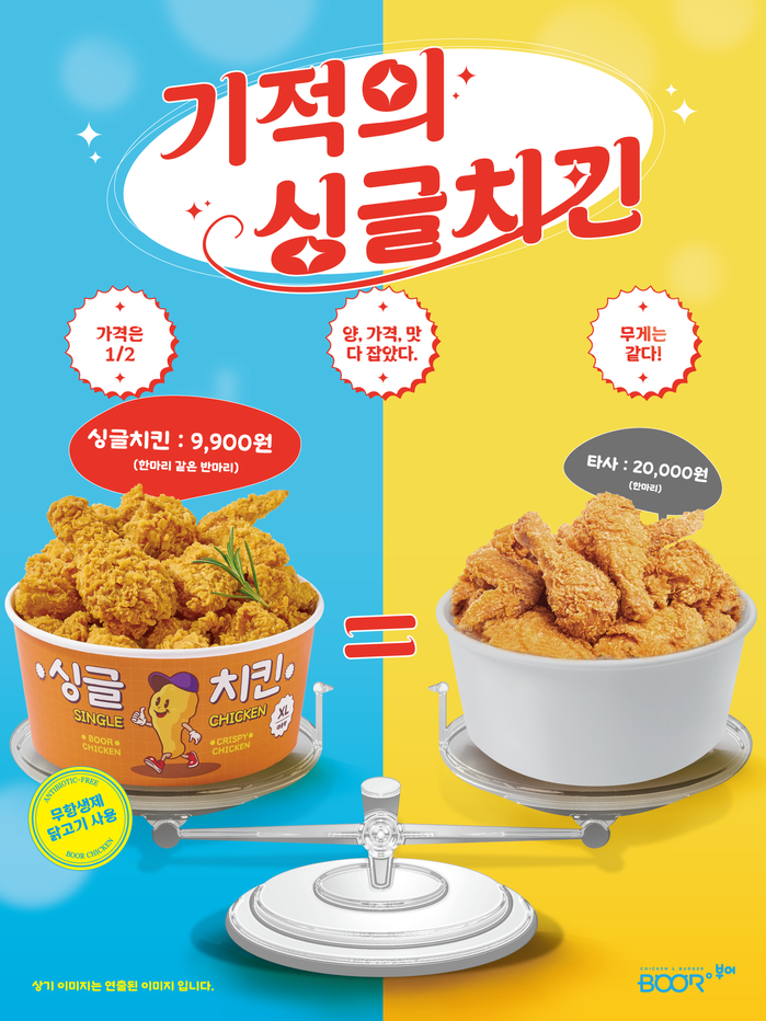 오는 26일, 전국 부어치킨 매장에서 공개될 ‘싱글치킨’ 및 ‘따블치킨’은 국내에서 직접 키운 신선 15호 계육을 사용해 가격을 낮추고 양을 두 배로 늘린 것이 특징이다. 한 마리 같은 반 마리 ‘싱글치킨’은 1만원이 안되는 가격에, 두 마리 같은 한 마리 ‘따블치킨’은 2만원도 채 되지 않는 가격대에 만날 수 있다.
