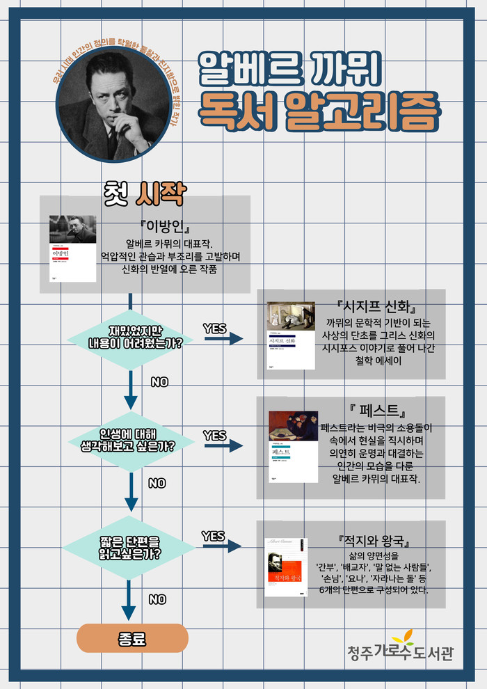 독서 알고리즘은 작가에 대해 깊이 읽기를 위한 취지로 마련한 것으로, 한 작가의 대표 도서를 보여주고 독서 흐름도(알고리즘)의 질문에 따라 자신이 읽고 싶은 책을 선택해 읽을 수 있다.