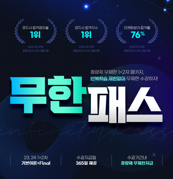 아이파 경영지도사 관계자는 “무한패스는 수험생들의 1,2차 동차 합격을 지원하기 위해 경영지도사 1위 교수진의 수준 높은 강의와 함께 교수진과 운영자가 직접 답하는 1:1 학습 Q&A 서비스 등의 학습 관리 시스템도 운영하고 있다"라며"한시적으로 진행되는 이벤트 과정에 대해 많은 수험생들의 관심과 빠른 수강신청을 바란다"라고 전했다.