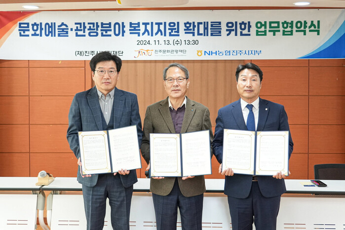 진주문화관광재단(대표이사 왕기영)은 13일 재단 2층 다목적홀에서 (재)진주시복지재단(이사장 이성갑), NH농협진주시지부(지부장 김정구)와 업무협약을 체결했다.