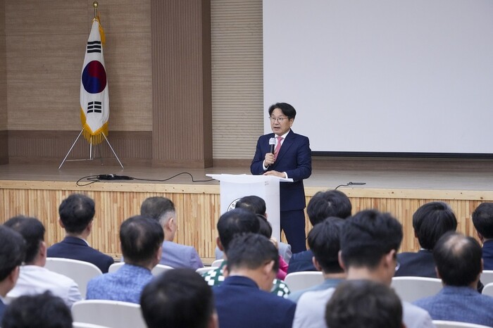 | ▲ 강기정 광주광역시장이 30일 오후 서구 염주체육관 내 국민생활관에서 열린 '광주 도시공원 조성사업 현장 설명회'에 참석해 인사말을 하고 있다./광주광역시 제공 |