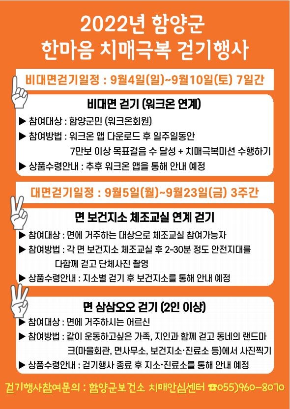 한마음 치매극복 걷기행사는 ‘치매 애(愛.)희망을 나누다.’라는 주제로 함양군민들이 치매에 대한 올바른 인식을 가지고 치매예방에 좋은 걷기를 일상생활 속에서 꾸준히 실천함에 목적을 두고 있다.