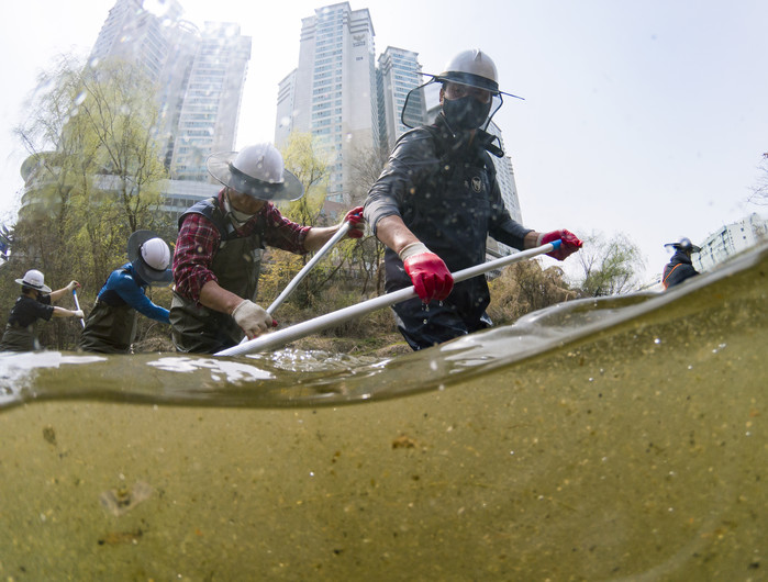 5일 오후 서울 성동구 청계천 황학교 인근에서 서울시설공단 관계자들이 빗자루를 이용해 바닥과 바위에 낀 녹조 및 침전물들을 쓸어 내고 있다. 서울시설공단은 오는 12일까지 청계천 시작 지점에서 고산자교까지 5.4km 구간의 하천 바닥을 청소할 예정이다.