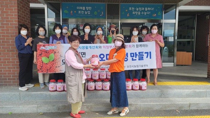 한국생활개선포천시연합회는 지난 16일 경기 포천시농업기술센터에서 의정부시생활개선회 회원을 대상으로 포천의 농산물인 오미자로 '비대면 오미자청 만들기'를 진행했다. 사진은 이날 만든 오미자청을 의정부시 회원에게 전달하고 있는 모습. (사진제공=포천시청)