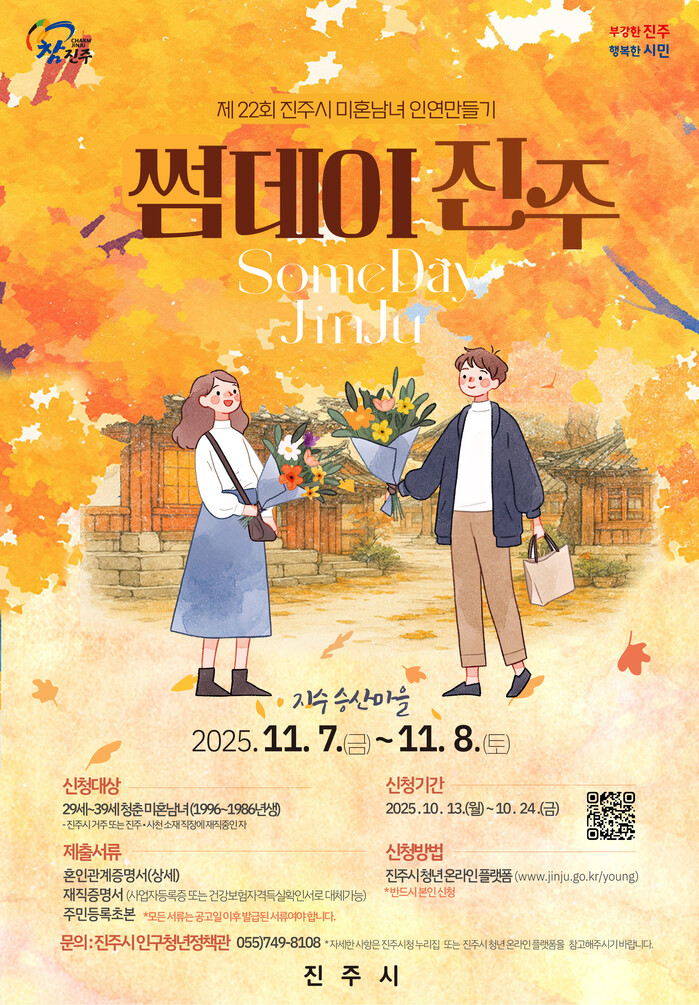 이번 행사는 오는 11월 7일과 8일, 1박 2일로 지수 승산마을 일원에서 열리며, 부자마을 데이트, 그룹 체험 등 가을의 청취를 느끼며 자연스럽게 인연을 알아갈 수 있는 프로그램으로 구성했다. 또한 진주시는 철도문화공원과 진주시립이성자미술관에서 열리고 있는 ‘2025 진주전통공예비엔날레’와 연계한 후속 이벤트도 계획해 참가자 간의 지속적인 만남을 유도해 ‘인연 만들기’에 적극 나설 예정이다.