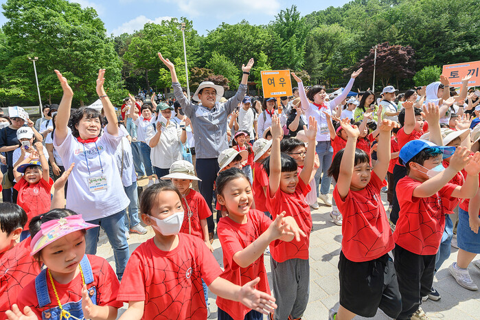 | ▲ 양천 어린이숲에서 아이들과 함께 레크리에이션 중인 이기재 양천구청장.(사진=양천구청 제공) |