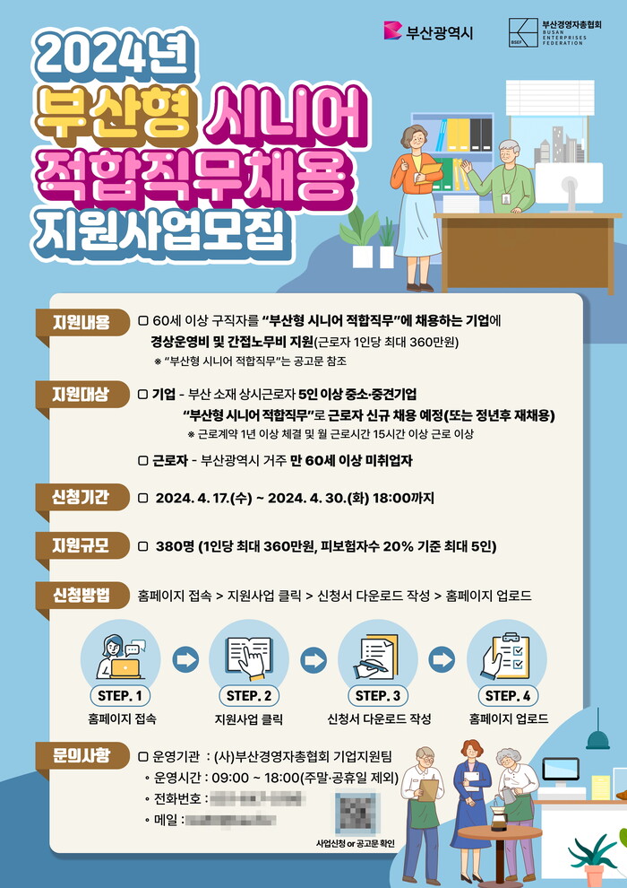 지원사업은 지역기업이 시가 선정한 부산형 시니어 적합 직무 분야에 60세 이상 구직자를 채용해 주 15시간 이상 근무, 계약직도 가능하다. 1년간 고용을 유지하면 채용기업에 1인당 매월 최대 30만 원씩 1년간 최대 360만 원의 인센티브를 지원한다.