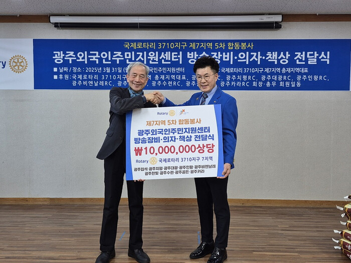 이준행 제7지역 회장 주관으로 전달된 기부물품은 1000만원 상당의 책상, 의자, 방송용 장비 등이다. 광주외국인주민센터는 지역 외국인주민들의 한국어 및 정보화, 초기정착 교육 등에 활용할 예정이다.
