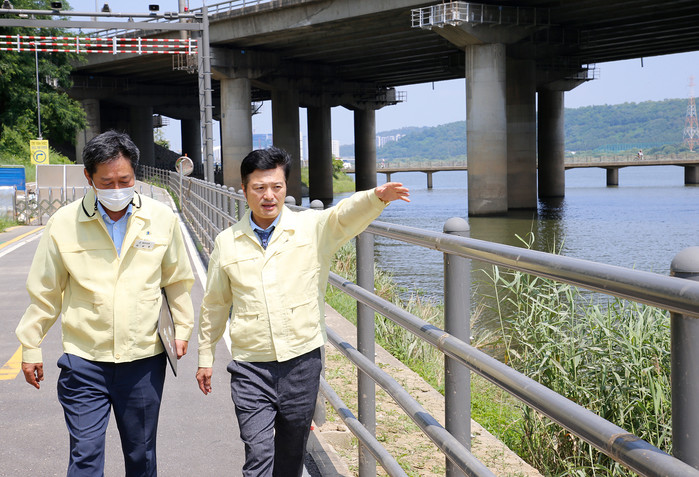 김태우 서울 강서구청장은 최근 주민 불편 해소를 위해 염창동 222번지 일대 안양천 진출입로 현장 점검에 나서 차도에서 안양천 산책로를 지나 한강 자전거도로까지 이어지는 구간을 수차례 왕복하면서 주민 불편사항을 챙기고 사업 추진방향에 대해 논의했다. 사진은 김 구청장(오른쪽)이 안양천 진출입로 일대를 찾아 현장을 살펴보고 있는 모습.(사진제공=강서구청)