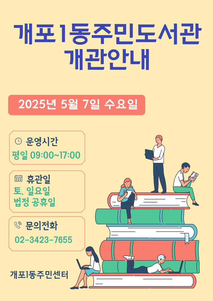 김영관 개포1동장은 “주민들의 자발적 참여로 개포1동 주민도서관을 개관하게 돼 매우 뜻깊게 생각한다”며 “보다 가까운 곳에서 편리하게 책을 접하고 지식과 문화를 나눌 수 있는 공간으로 조성한 이곳이 단순히 책 읽는 공간을 넘어 세대와 이웃이 소통하는 문화 사랑방이 되길 바란다”고 말했다.