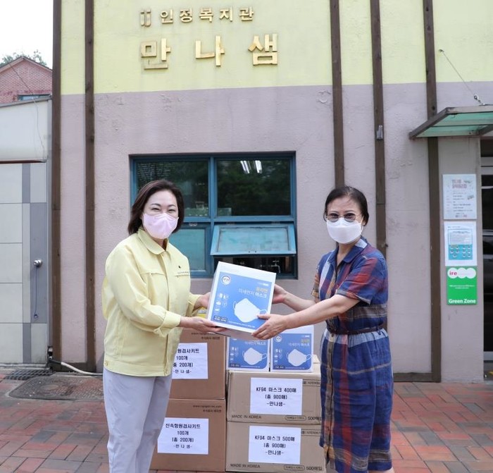 박희영 서울 용산구청장이 최근 코로나19의 급속한 재확산에 대응하기 위해서 다시서기종합지원센터(시립) 등 지역내 노숙인 시설을 찾아 마스크, 방호복 등 방역물품을 전달하고 관계자를 격려했다. 사진은 이날 박희영 구청장(왼쪽)이 노숙인 일시보호시설 만나샘에 방역물품을 전달하고 있는 모습.(사진제공=용산구청)