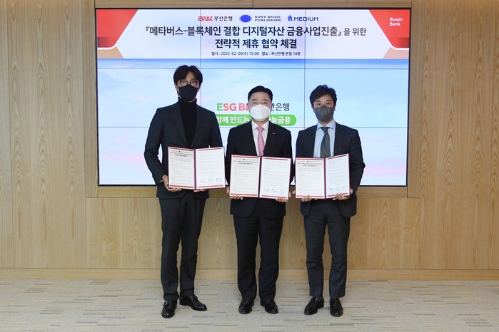 [시민일보 = 여영준 기자] BNK부산은행은 9일 오후, 본점에서 소니뮤직퍼블리싱(한국지사), ㈜미디움과 디지털자산 금융사업 진출을 위한 ‘메타버스-블록체인 전략적 제휴’ 협약식을 실시했다고 밝혔다.