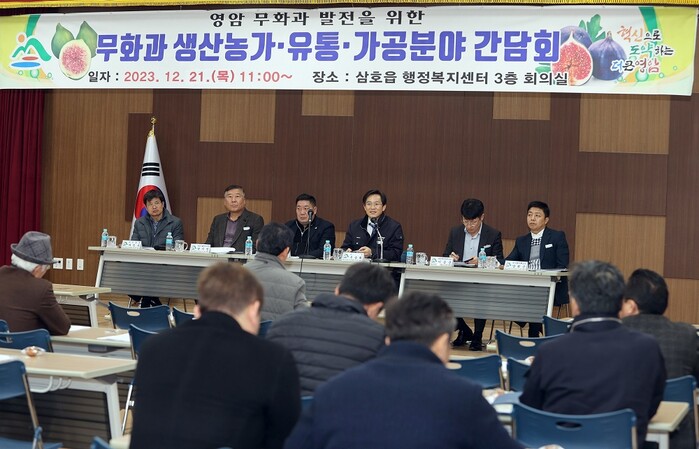 | ▲ 우승희 영암군수가 지난 21일 삼호읍행정복지센터에서 무화과 생산·가공·유통 및 농협 관계자 대상으로 ‘무화과 산업발전 3개년 계획과 혁신 방안 현장 간담회’를 주재하고 있다. / 영암군 제공 |