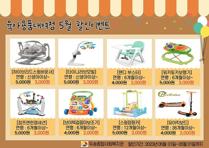 [부산=최성일 기자] 두송종합사회복지관(관장 김태형)은 사하구 다대2동 4지구BMC아파트 내 두송종합사회복지관 육아용품대여점 [아이꿈터]에서는 매월 대여료 반값 할인과 이용후기 작성 등 다양한 이벤트를 진행하고 있다.