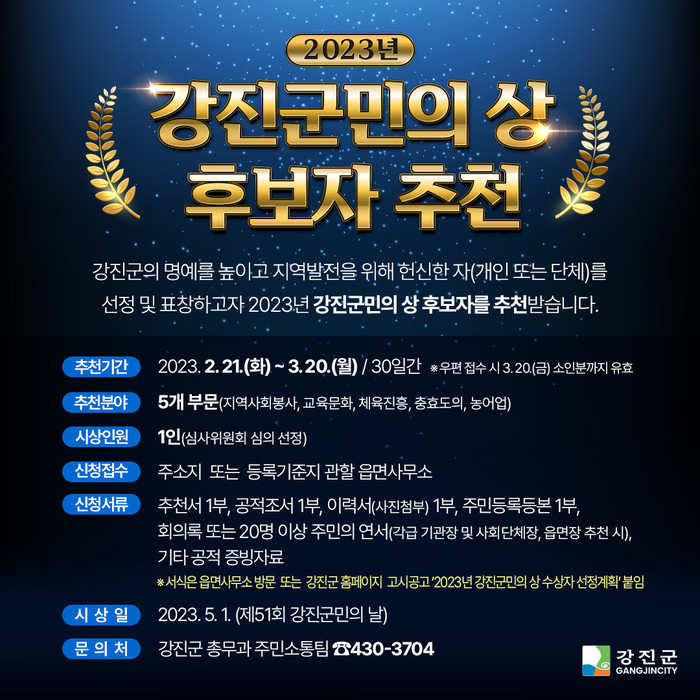 군은 최종 수상자를 오는 4월 17일까지 군민의상 심사위원회에서 수상자 선정 기준에 따라 선발할 계획이며, ‘제51회 강진군민의 날 기념행사장’에서 상을 수여할 방침이다.