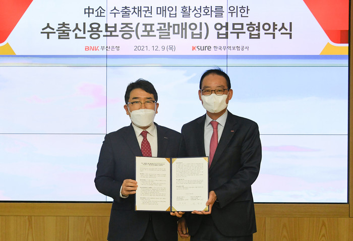 | ▲ (오른쪽부터) 부산은행 명형국 여신운영그룹장, 한국무역보험공사 윤종배 중소중견사업본부장이 기념촬영을 하고 있다.(사진제공=BNK부산은행) |