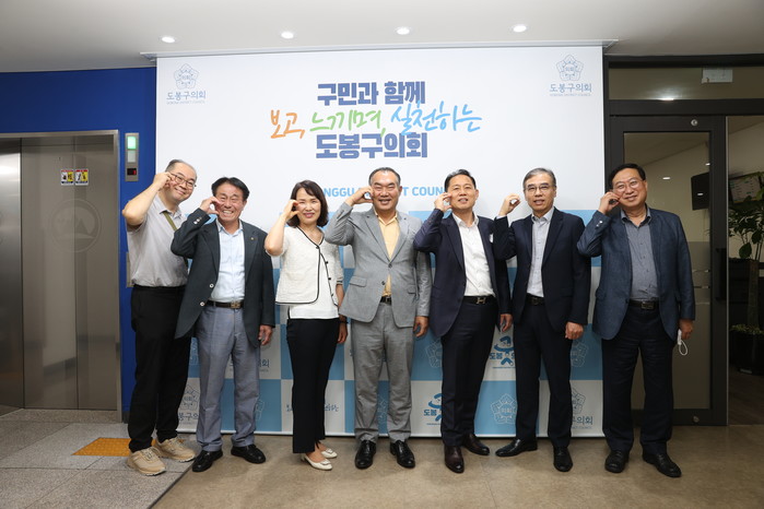 | ▲ 강신만 의장(가운데)과 도봉구상공회 임원진들이 기념촬영을 하고 있는 모습. (사진제공=도봉구의회) |