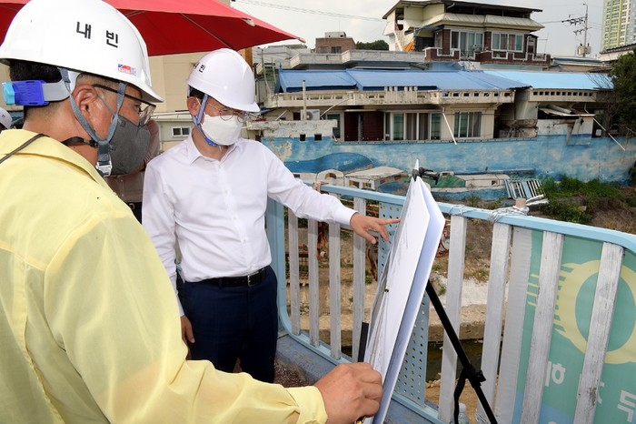 [광주=정찬남 기자] 문영훈 광주광역시 행정부시장이 20일 오후 서방천 개수공사 현장인 신안교 일원을 찾아 관계자로부터 현황을 보고 받은 후 장마철 침수 대비에 만전을 다 해줄 것을 당부하고 있다. /광주광역시 제공