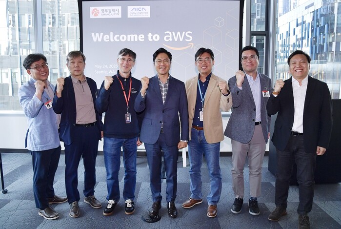 | ▲ 김광진 광주광역시 문화경제부시장이 24일 오후(현지시간) 미국 시애틀 아마존웹서비스를 찾아 아밋 쿠마(Amit Kumar, 기술전략리더)과 아마존과 광주 인공지능 데이터센터 간 연계방안에 대해 논의한 뒤 대표단과 기념촬영을 하고 있다./광주광역시 제공 |