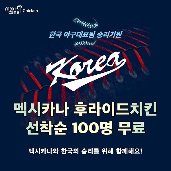 더불어 멕시카나는 이번 대회의 가장 주목되는 한일전 승리기원을 위해 멕시카나 배달앱 회원 대상 선착순 100명에게 후라이드를 무료 증정하며, 모든 고객에게는 4천 원 할인 쿠폰도 제공한다. 자세한 내용은 멕시카나 앱이나 SNS를 통해 확인할 수 있다.