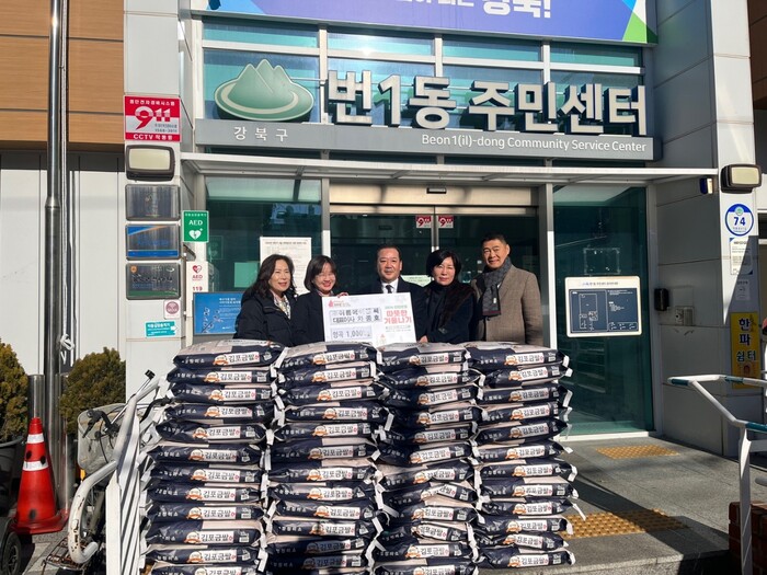 서울 강북구 번동에 위치한 (주)이룸에이앤씨가 지난 30일 어려운 이웃을 위해 양곡 1000kg를 번1동주민센터에 기부했다. 기부한 양곡은 ‘2024 희망온돌 따뜻한 겨울나기사업’에 기탁돼 지역내 기초생활수급자 등 도움이 필요한 저소득 가구에 지원될 예정이다. 사진은 전달식에서 관계자들이 기념촬영을 하고 있는 모습. (사진=강북구청 제공)