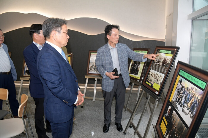 [광주=정찬남 기자] 강기정 광주광역시장은 13일 시청 1층에서 열린 '광복 80년 특별사진전'을 관람하고 있다./광주광역시 제공