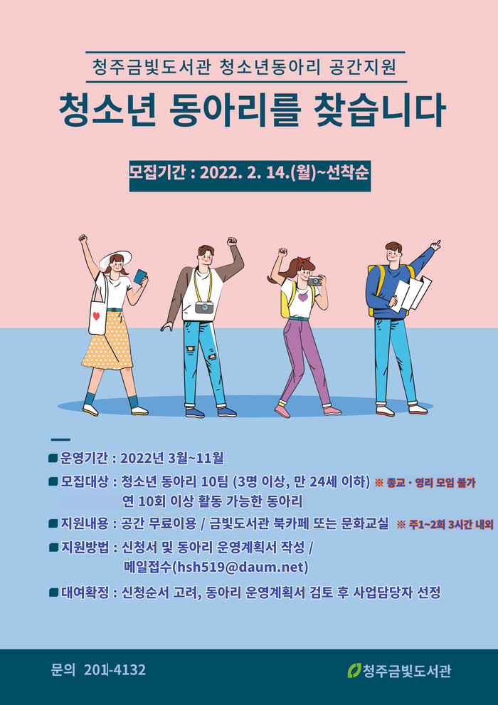 청주금빛도서관(관장 이미영)이 청소년의 긍정적이고 진취적 발달을 도모하는 동아리 활동 지원을 위해 청소년 동아리 10팀을 대상으로 모임 공간을 지원한다.