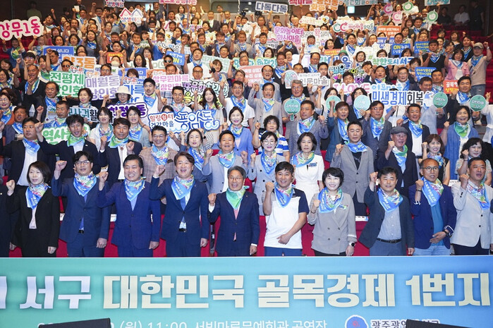 [광주=정찬남 기자] 강기정 광주광역시장(사진 앞줄 가운데)이 30일 오전 서구 서빛마루문예회관 공연장에서 열린 '대한민국 골목경제 1번지 선포식'에서 김이강 서구청장, 상인회장 등 참석자들과 기념촬영을 하고 있다./광주광역시 제공