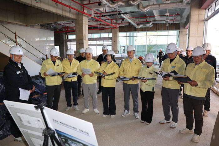 | ▲ 지난 28일 보성군 복합커뮤니티센터 공사 현장을 방문한 특별위원회 위원들이 공사 진행사항을 보고 받고 있다. (사진=보성군의회 제공) |