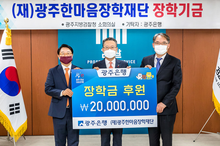 [시민일보 = 이대우 기자] 광주은행(은행장 송종욱)은 최근 광주지방검찰청에서 지역에 소외된 청소년들의 학업 지원을 위해 (재)광주한마음장학재단에 2천만원의 장학금을 전달했다고 밝혔다.