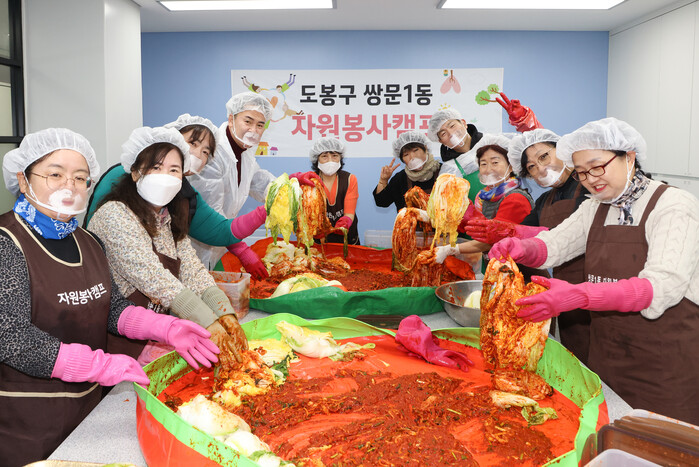 서울 도봉구 쌍문1동 자원봉사캠프는 최근 ‘사랑의 김장 나눔’ 행사를 진행했다. 이날 담근 김치 5kg, 30상자는 지역내 홀몸노인 등 도움의 손길이 필요한 취약계층 30세대에 전달됐다. 사진은 이날 오언석 구청장(왼쪽 네번째)이 김장봉사에 참여하고 있는 모습.(사진=도봉구청 제공)