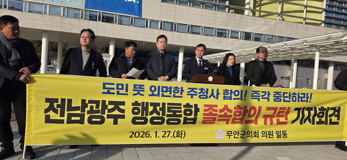 [무안=황승순 기자]무안군의회(의장 이호성)는 27일 전남도청 잔디광장에서 기자회견을 열고, 이날 발표된 전남·광주 행정통합 관련 합의 내용을 두고 “깊은 유감을 넘어 강력한 분노를 표한다”며 김영록 전라남도지사를 정면으로 규탄했다.
