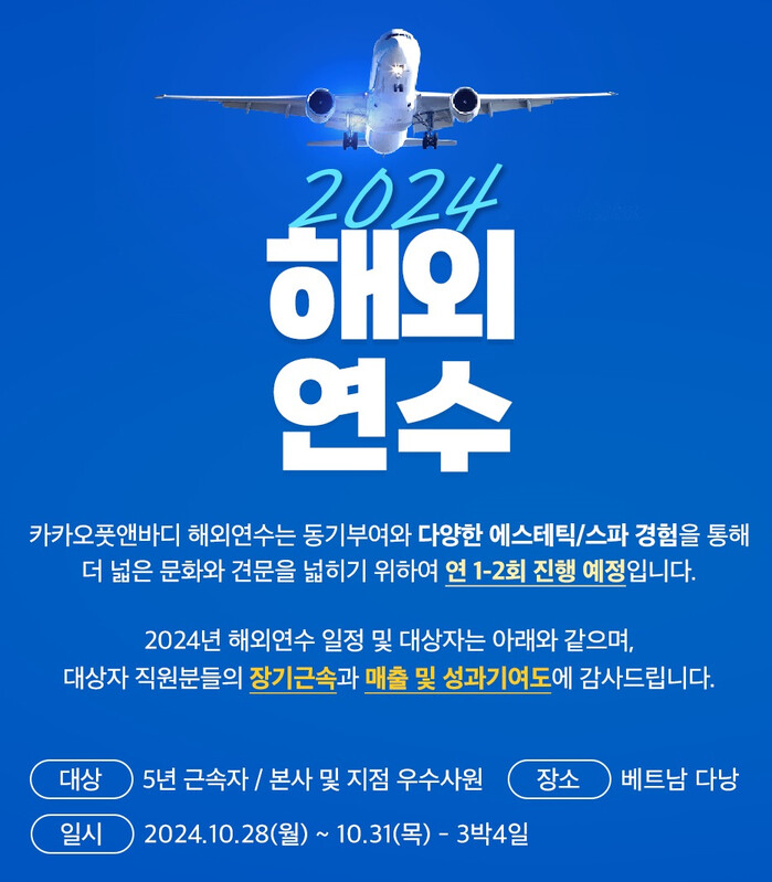 카카오풋앤바디는 매 분기 우수직원을 선정하여 이들에게 특별한 경험을 제공하고자 한다. 이번 연수는 특히 베트남 다낭의 아름다운 자연과 문화 속에서 진행 될 예정이다. 연수 프로그램에는 현지 바디케어샵의 시설과 관리를 직접 받아보며 문화 체험 활동이 포함되어 있어 직원들이 다양한 지식과 경험을 습득할 수 있는 기회 역시 같이 제공된다고 한다.