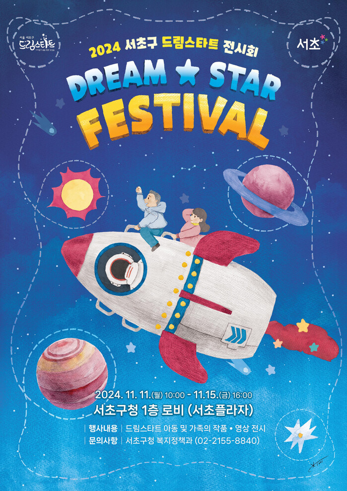 특히 이번 전시는 드림스타트 아동의 무한한 꿈과 미래를 상상력 넘치는 우주 공간으로 표현하여 주민들에게 예술적 경험을 제공한다. 공간연출 및 디자인 작업에는 2024 서초청년갤러리 아티스트 권선이 작가가 참여했다.