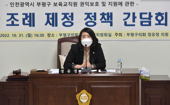 [인천=문찬식 기자] 정유정 인천 부평구의회 의원이 최근 도시환경위원회실에서 ‘인천광역시부평구 보육교직원 권익보호 및 지원에 관한 조례안’ 발의를 위한 의견수렴 간담회를 실시했다.