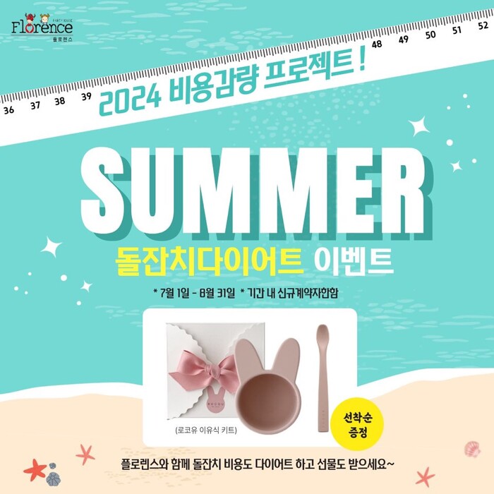플로렌스 관계자는 “이번 2024년 돌잔치 썸머이벤트는 신규 계약 시 △식대 10% 할인 △돌상패키지 20% 할인 △로코유 이유식키트 선물증정으로 총 3가지 구성으로 더욱 풍성한 혜택으로 준비됐다”고 전했다.