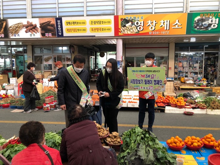문준희 합천군수가 18일 합천왕후시장에서 ‘함께 해요’ 동네시장 장보기 릴레이 캠페인에 참여했다,