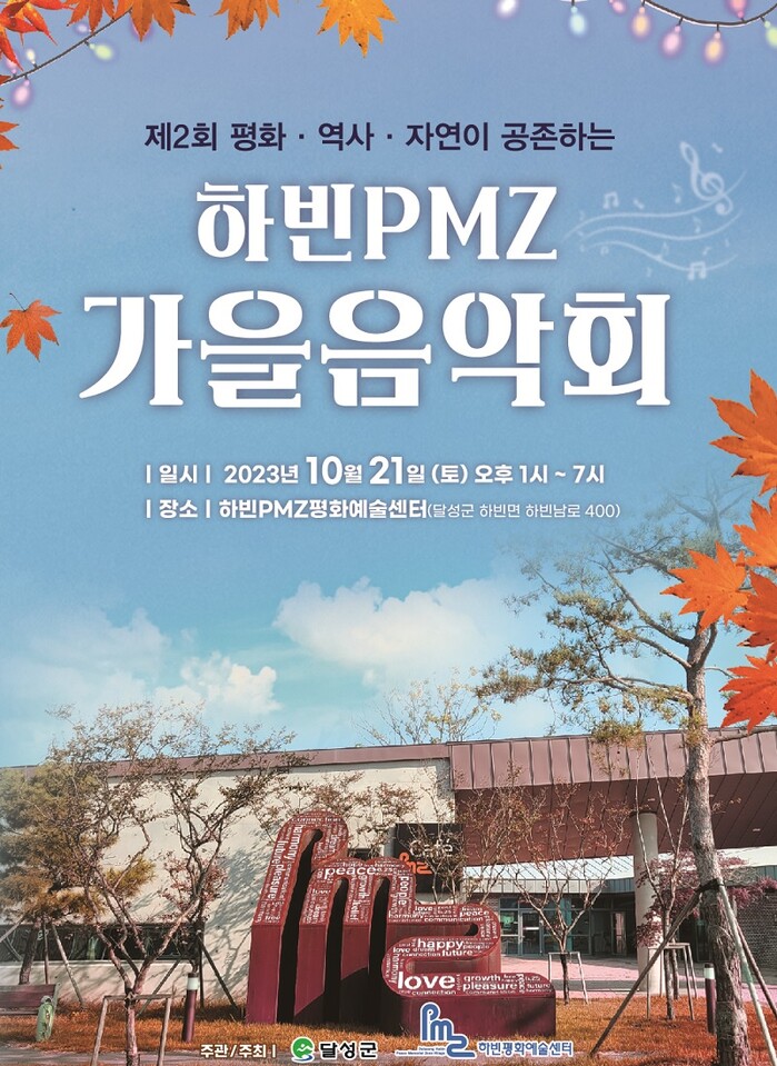 하빈PMZ 가을음악회는 6.25 피난민들에 의해 만들어진 하빈면 봉촌2리 전재민촌에 한강이남에서 최초로 평화라는 콘셉트로 건립된 하빈PMZ평화예술센터에서 진행되는 행사로, 역사를 보존하면서도 평화의 소중함을 일깨워 줄 수 있는 소중한 첫 걸음에 의미를 두고 있는 하빈PMZ 평화기념 마을조성 사업의 의미를 더 많은 이들에게 알리고자 지난해 처음 시작됐다.
