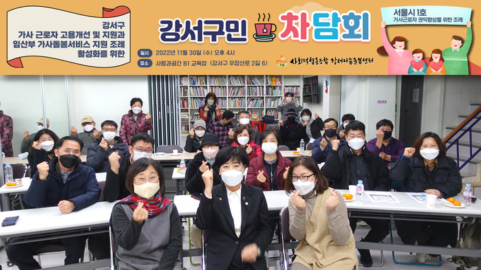 [시민일보 = 홍덕표 기자] 서울 강서구의회(의장 최동철) 이종숙 의원이 최근 강서돌봄나눔센터 교육장에서 열린 '가사근로자의 권익 향상을 위한 강서구민 차담회'에 참석했다.