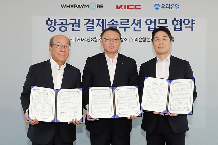 [시민일보 = 여영준 기자] 우리은행이 지난 8월30일 항공권 전문 플랫폼 와이페이모어 및 전자결제대행사 한국정보통신과 함께 혁신적 항공권 결제솔루션을 제공하기 위한 3자 간 업무협약을 체결하고 항공권 전용 결제서비스를 구축하기로 했다.