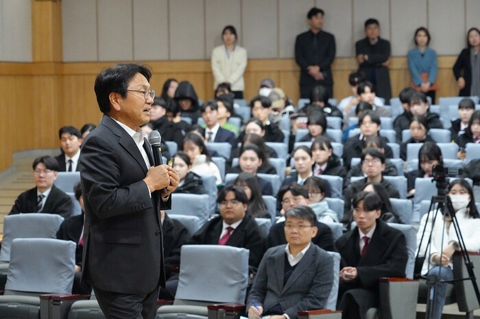 | ▲ 강기정 광주광역시장이 28일 오후 광산구 호남대학교에서 ‘변화하는 광주, 청년을 위한 기회와 약속’을 주제로 열린 토크콘서트에 참석해 광주시 청년정책 등을 설명하고 있다./광주광역시 제공 |